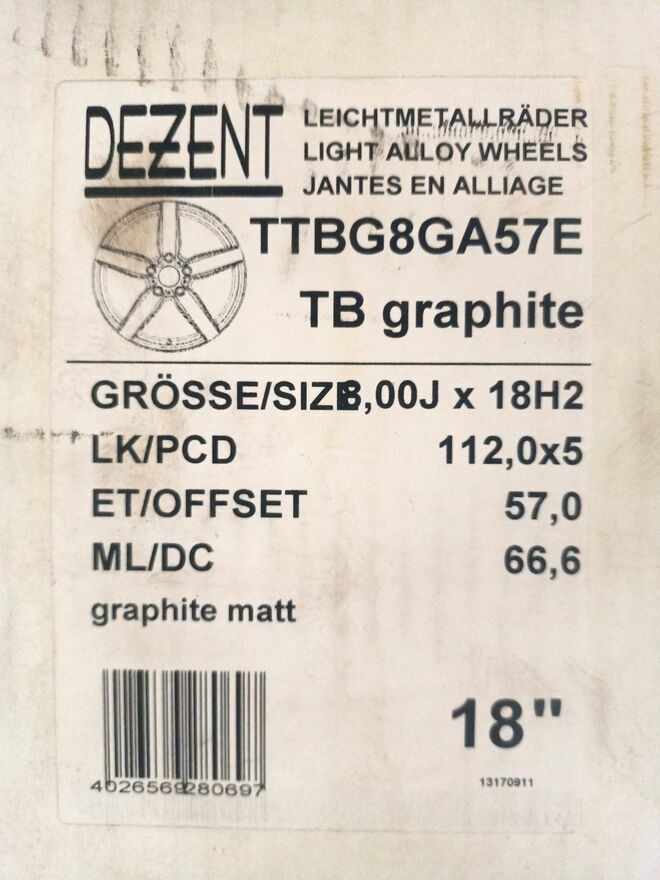 Alufelgi Dezent TB Graphite 18", rozstaw 5x112, et 57. Felgi nowe, nie używane. Stan wizualny bardzo dobry. Niestety nie znam stanu technicznego. Nie widać żadnych uszkodzeń.Cena 800 zl do negocjacji po sprawdzeniu przez kupującego. Preferuję odbiór osobisty