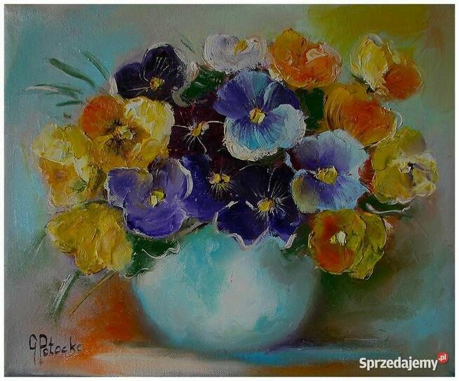 Na obrazie widzimy bukiet kolorowych kwiatów bratków w subtelnej, pastelowej tonacji. Bogactwo fioletów, żółci i ...