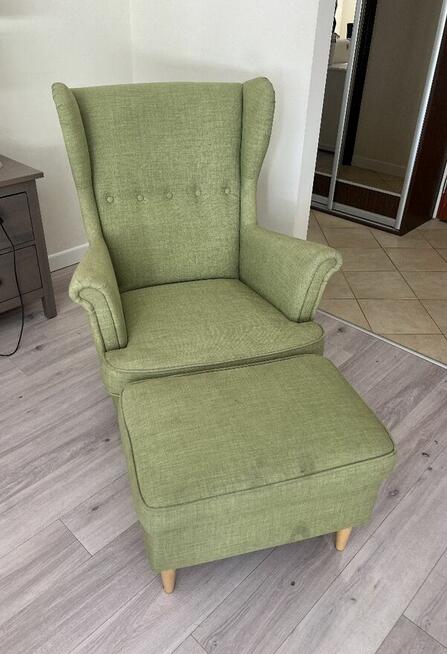 Fotel uszak IKEA STRANDMON w kolorze zielonym (Skiftebo green) wraz z podnóżkiem — sprzedaję jako komplet. Model ...