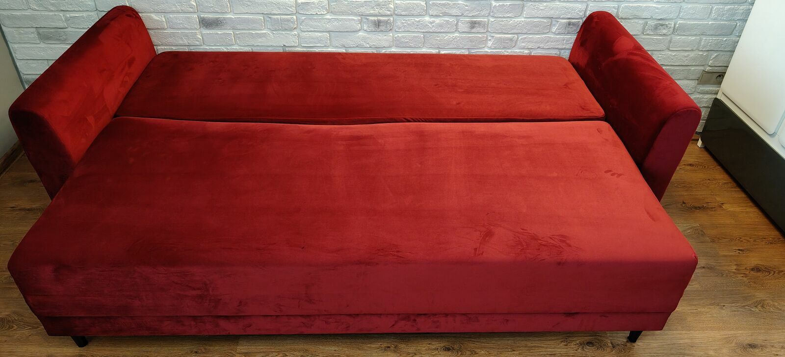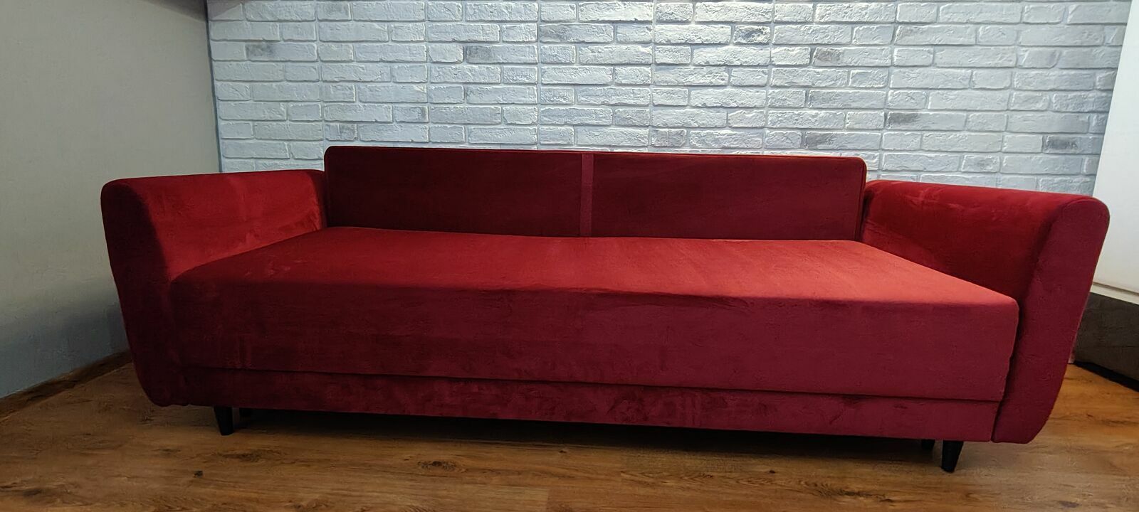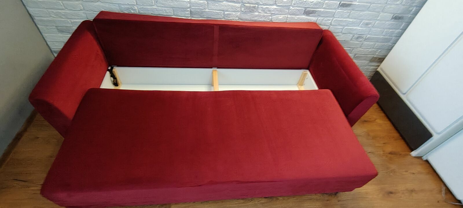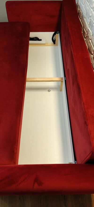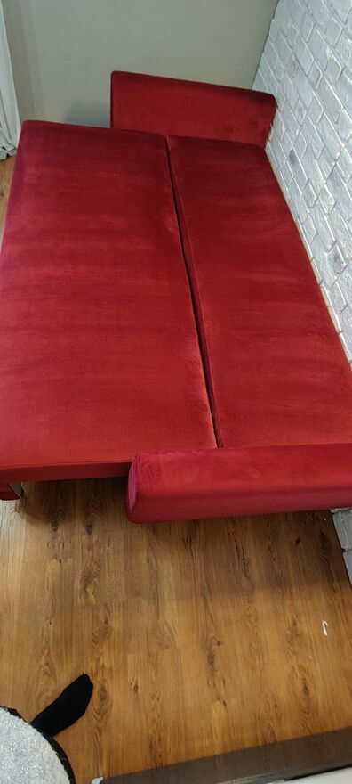 Sprzedam kanapę welurową dwuosobową w kolorze ciemno czerwonym z funkcją spania. Nie zniszczona, w idealnym stanie. Posiada duże wieko na pościel, kanapa stoi na nóżkach. Boczki są zdejmowalne, są na szynach. Kanapa posiada dwa duże zagłówki - tak jak jest na zdjęciach.Powierzchnia spania: dł.: 195cm, szer.: 142cm