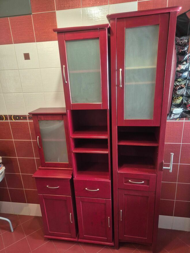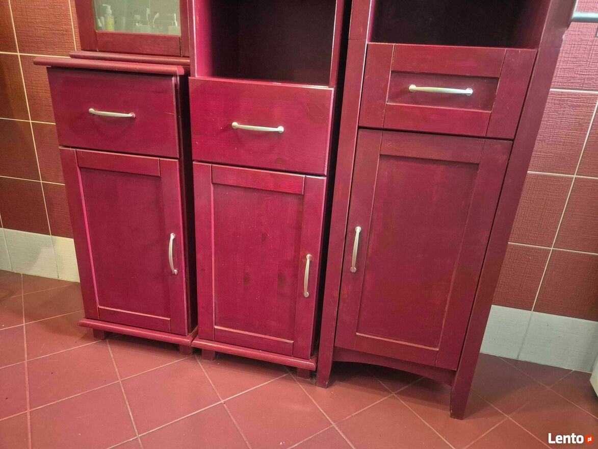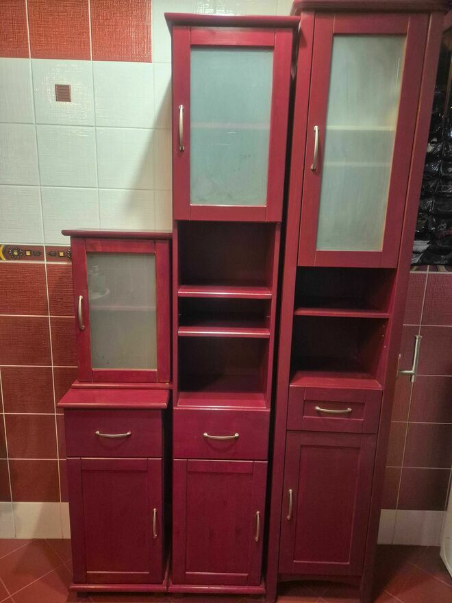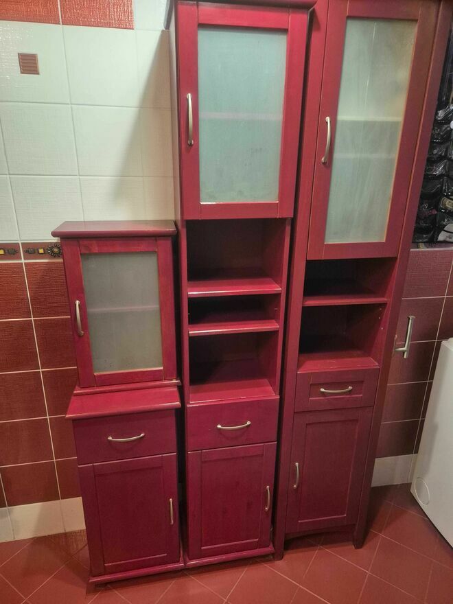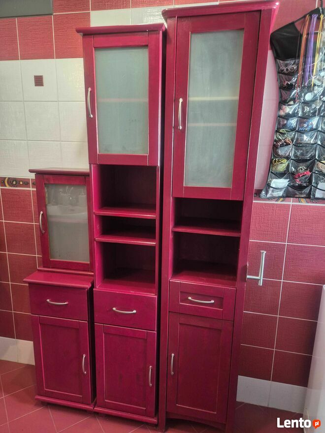 Zapraszam do zakupu kompletu szafek łazienkowych w kolorze burgund / bordo.2 słupki jak na zdjęciach ( w środku i po prawej stronie) wysokość 187,5 i 192,5 cm, szerokość 32 i 37 cm, głębokość 29 cm.