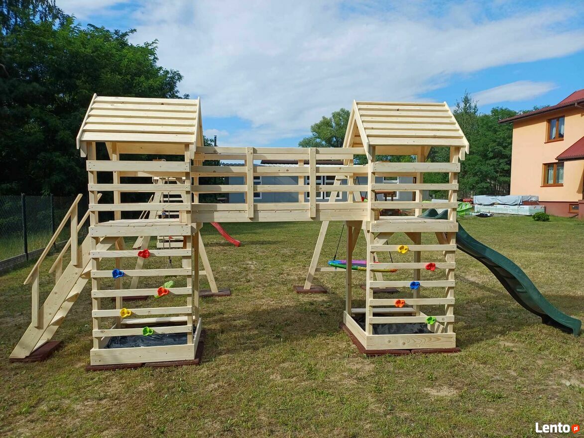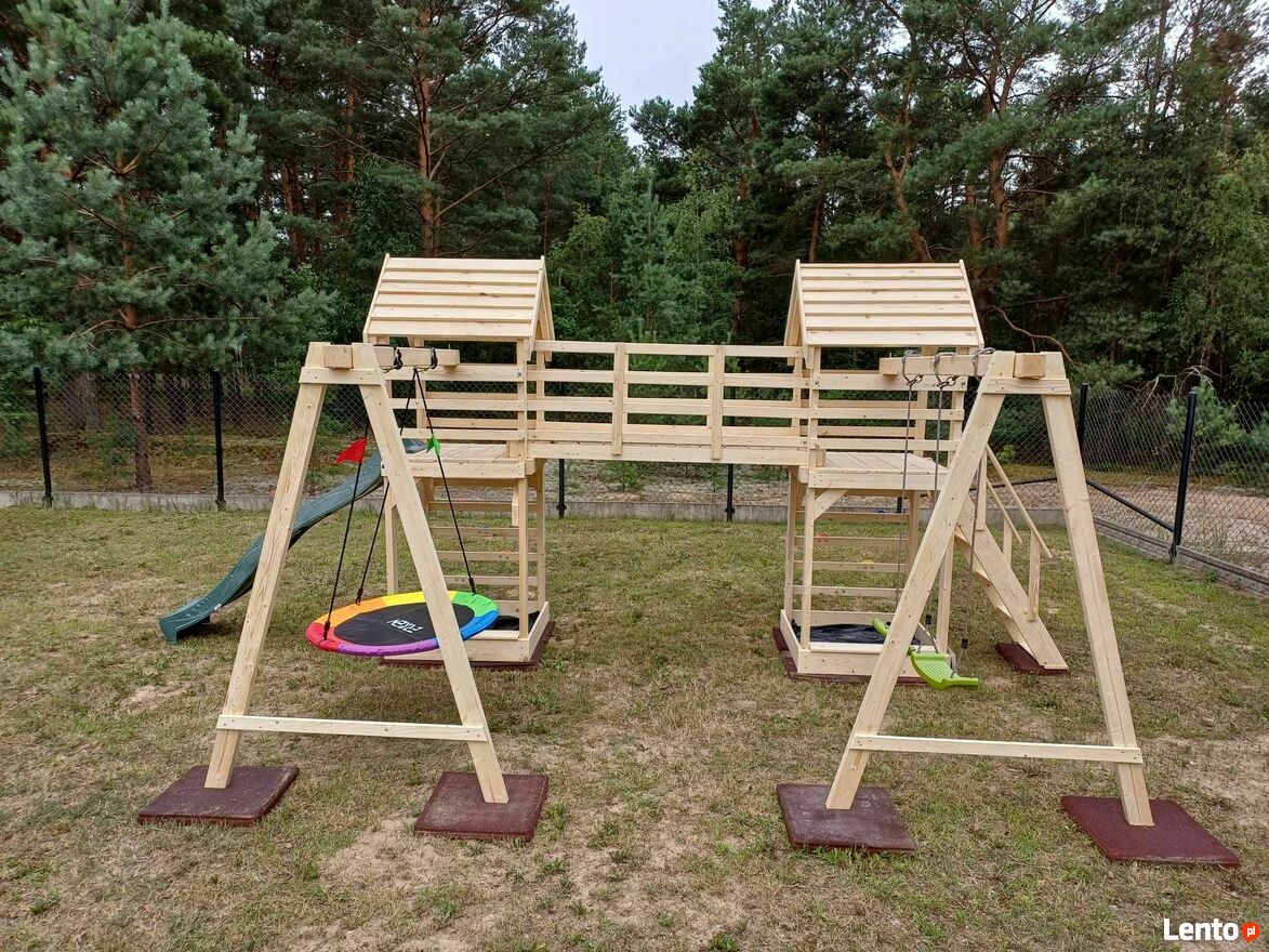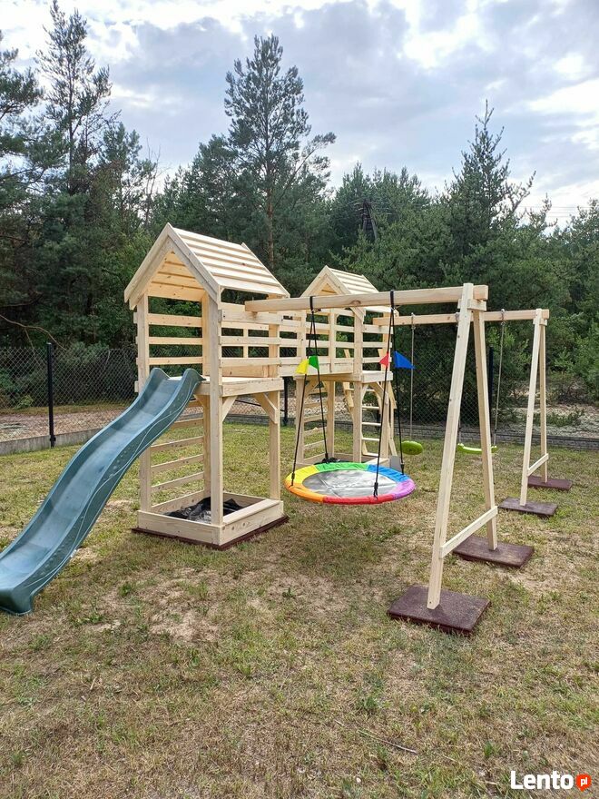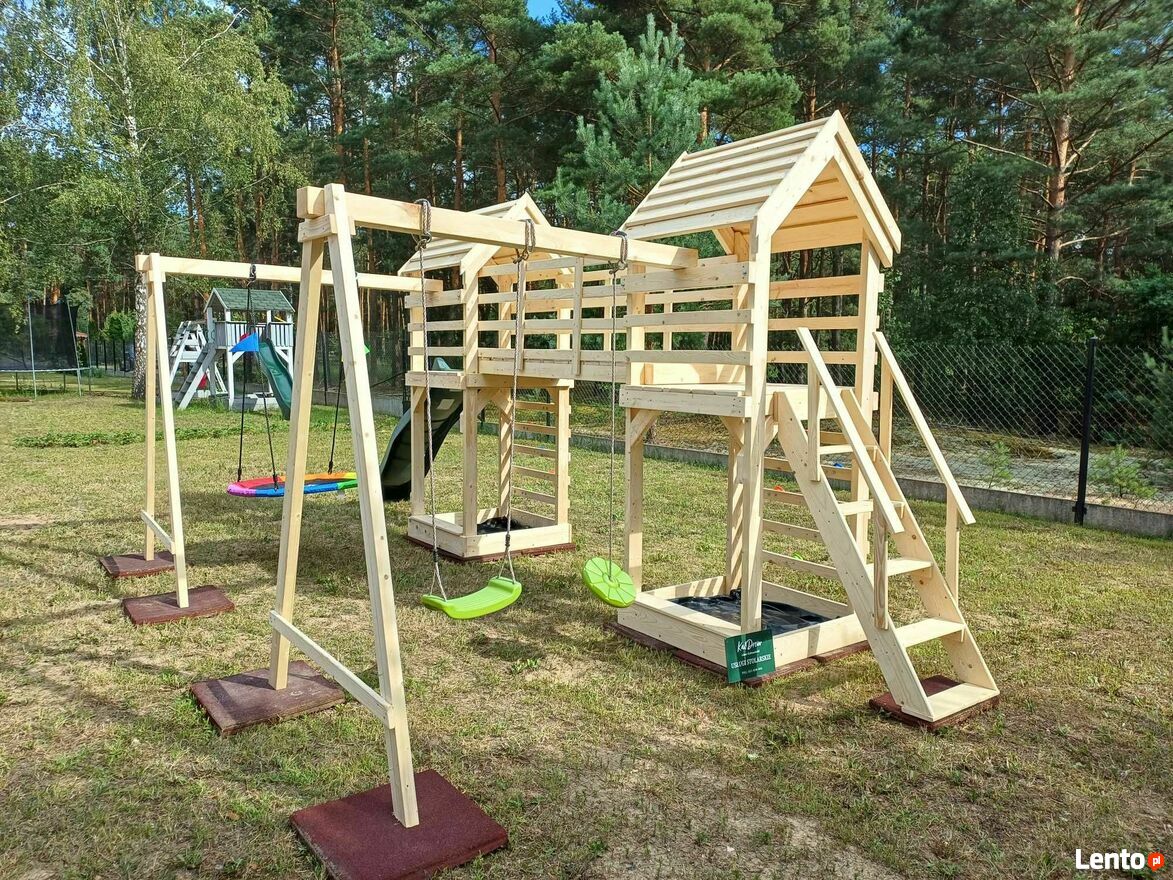 Plac zabaw w danym ogłoszeniu nie zawiera widocznego na zdjęciach ślizgu/zjeżdżalni, kamieni do wspinaczki oraz huśtawek plastikowych. Należy je zakupić osobno.