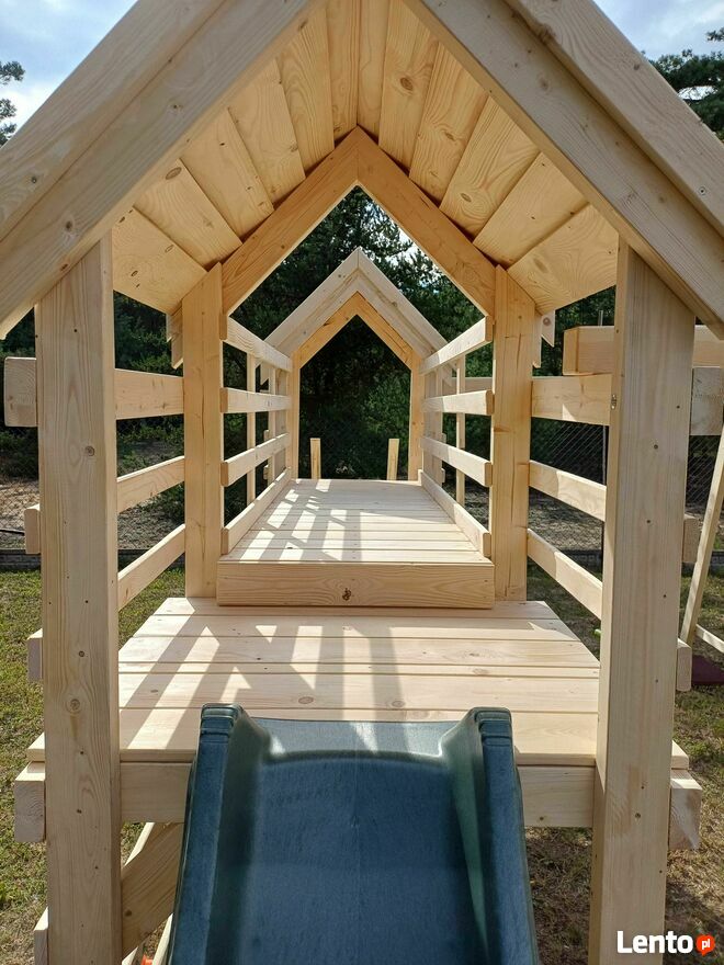 Zestaw jest dostarczany do samodzielnego montażu (w większości przez nas skręcony aby montaż nie stanowił problemu oraz nie zajął zbyt wiele czasu). Dostawa na terenie całej Polski spedycją RABEN - dodatkowy koszt 400zł lub odbiór osobisty pod adresem: 09-401 Płock ul. Tokarska 40 KalDrew po wcześniejszym kontakcie telefonicznym oraz rezerwacji placu zabaw ze względu na dużą jego sprzedaż. Dane ogłoszenie dotyczy konstrukcji drewnianej placu zabaw (wszystko opisane w dalszej części treści ogłoszenia).Plac zabaw wykonany bardzo solidnie oraz starannie. Do budowy konstrukcji została zastosowana kantówka o przekroju 5x10cm, górna belka huśtawki to kantówka o przekroju 10x10cm natomiast wszystkie deski są grubości 2,5cm (należy od wymiarów odjąć kilka mm ponieważ drewno przechodzi proces strugania, frezowania oraz szlifowania. Odpowiednio dobrane materiały, zastosowane wkręty ciesielskie oraz rzetelnie wykonana konstrukcja zapewnia duża wytrzymałość. Drewno jest surowe przez nas nie impregnowane. Po montażu zalecamy aby je odpowiednio zabezpieczyć.