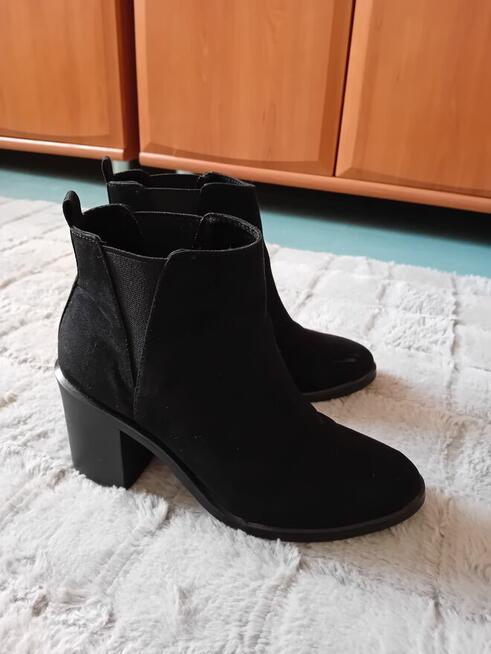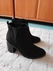 Botki marki Stradivarius w kolorze czarnym z zamszowej tkaniny, używane. Niewielkiej ślady użytkowania, widoczne na ...