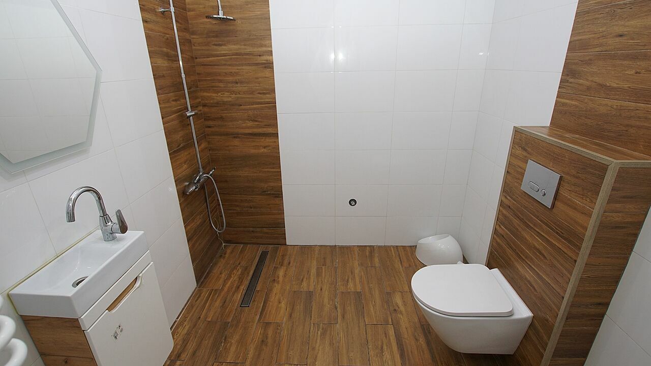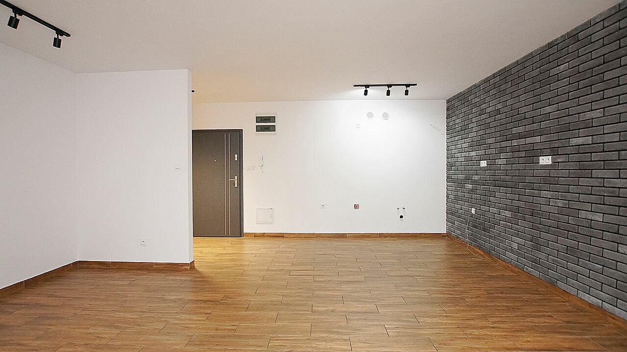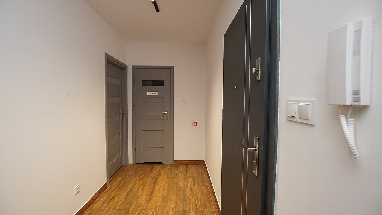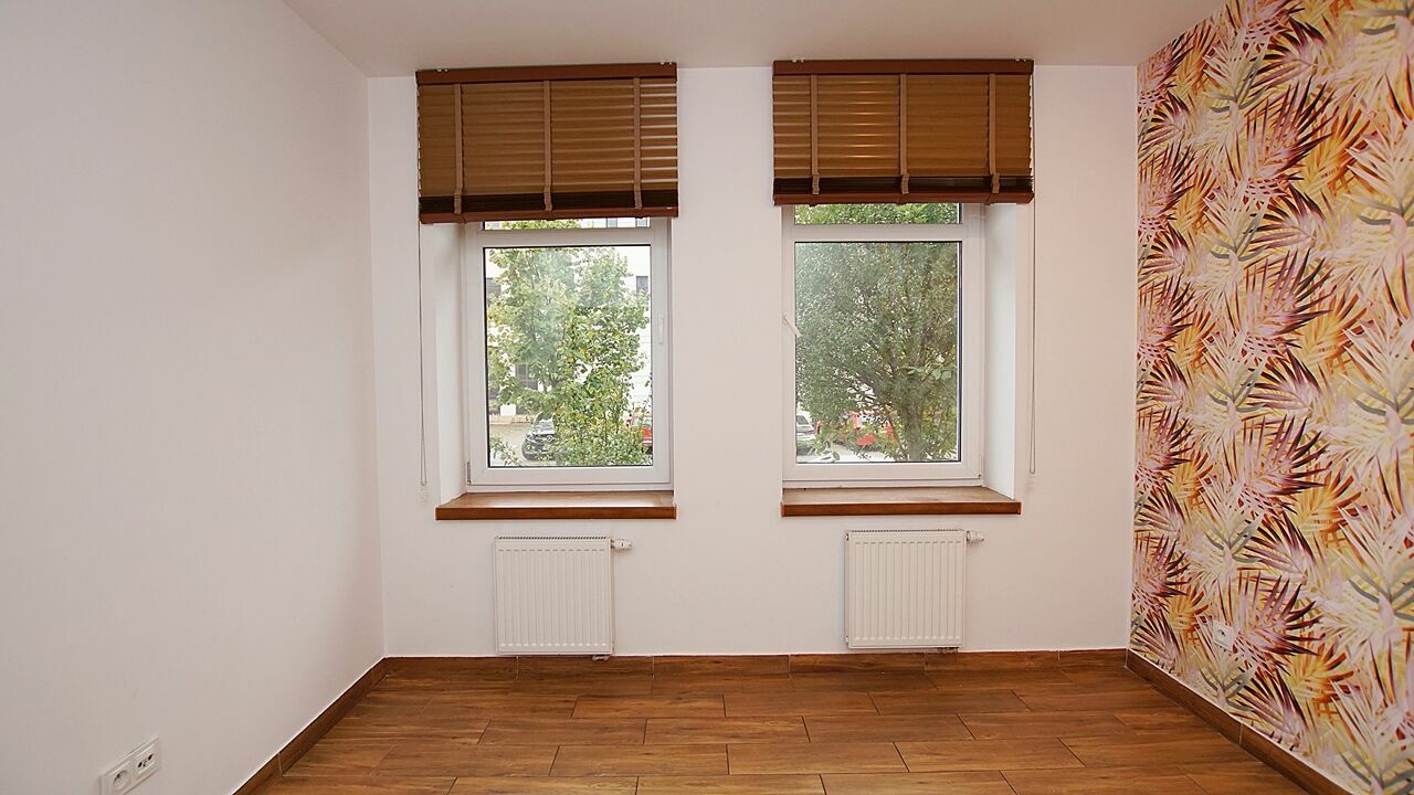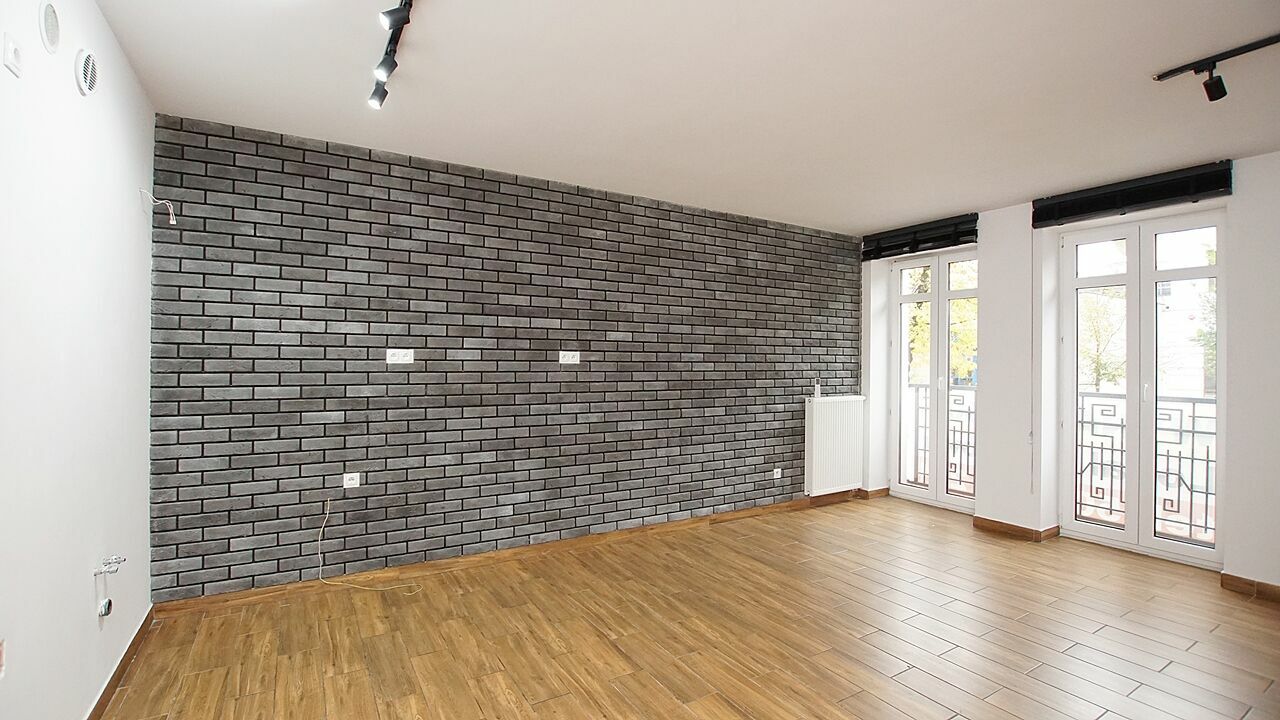 Nieruchomość posiada dwa wygodne pomieszczenia, dużą łazienkę z natryskiem oraz przedpokój. W większym częściowo otwartym na hol pokoju zamontowana została klimatyzacja, w tym pokoju znajduje się wyjście na balkon, tu na jednej ze ścian króluje szara cegła, w oknach zamontowane są modne żaluzje. Mniejszy pokój posiad drzwi, dwa okna dające światło dzienne a na ścianie znajduje się ekstrawagancka tapeta. W całym lokalu na podłogach znajduje się jednolita glazura przypominająca drewnianą deskę co znacznie ociepla lokal.