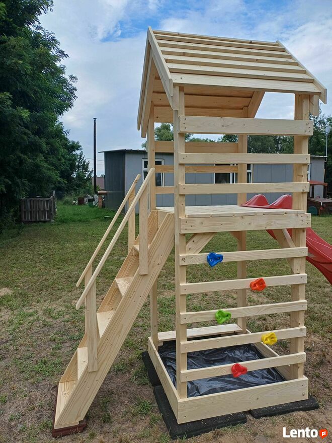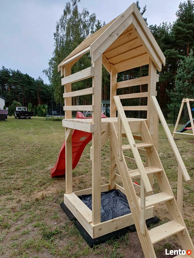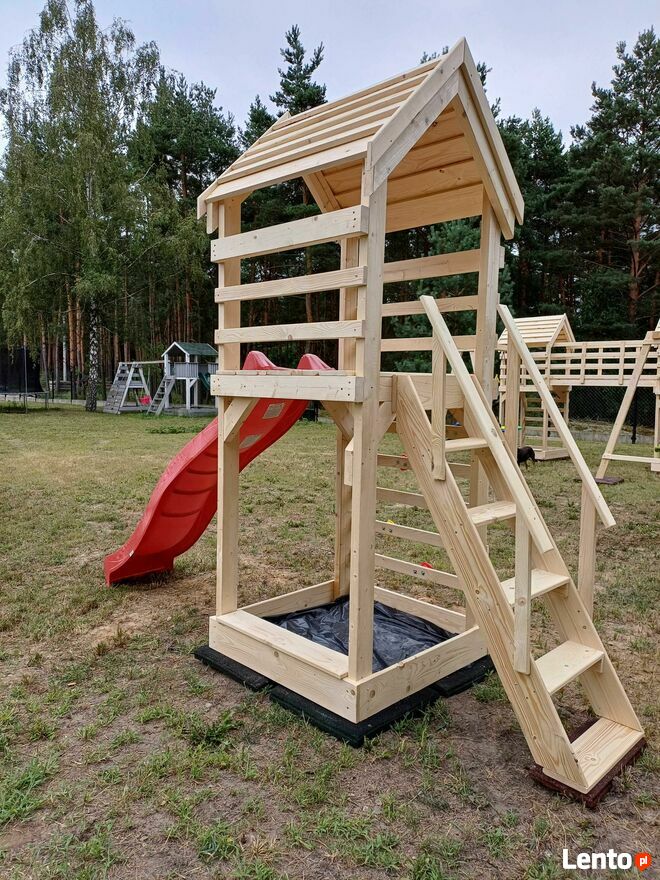 - drewniany domek/ wieże wraz z piaskownicą oraz szczebelkową ściankę wspinaczkową