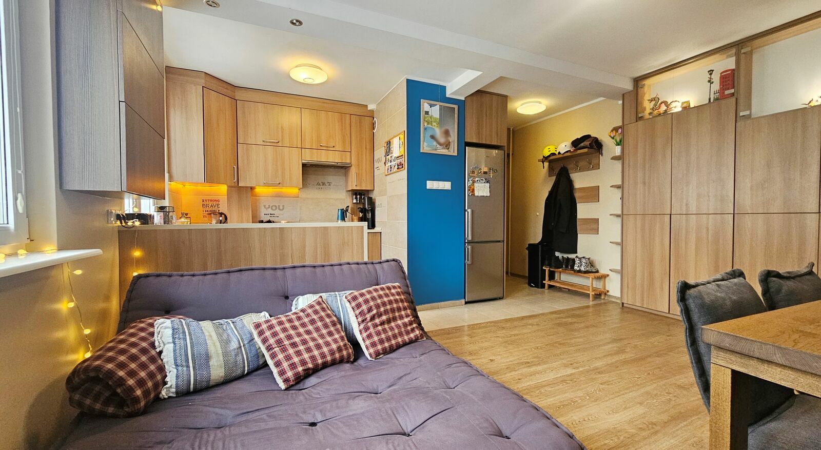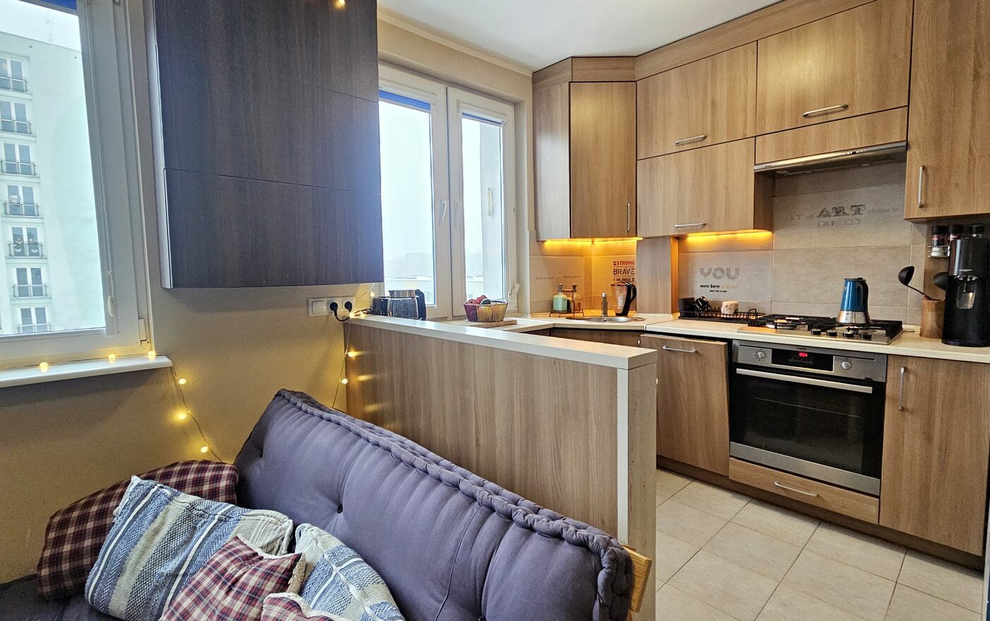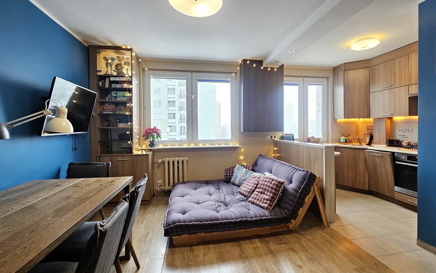 Mieszkanie dwustronne, posiada pięknie doświetlony pokój dzienny połączony z aneksem kuchennym, 2 sypialnie, łazienkę z wc. Kilka lat temu przeszło gruntowny remont ( wymiana instalacji , nowe tynki, stolarka, zabudowa stała wykonana pod wymiar w pokojach , w kuchni ️ pozostaje w cenie mieszkania, wraz ze sprzętami agd ( zmywarka, kuchenka, lodówka, pralko-suszarka ️ ).