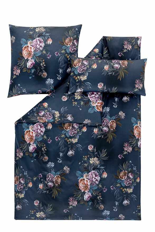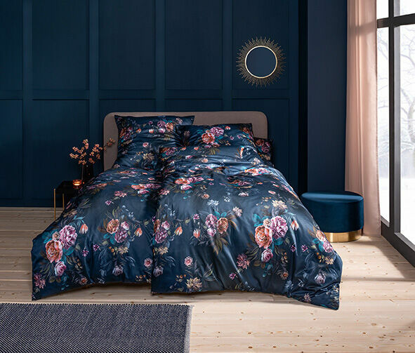 Elegancka pościel w piękny kwiatowy wzór na granatowym jak nocne niebo tle.