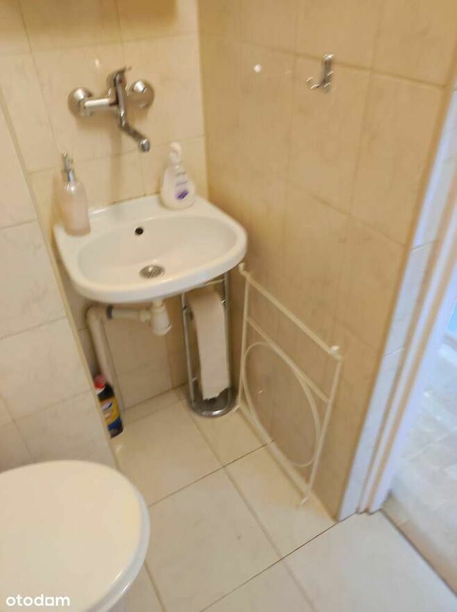 - Łazienka: ok. 1,80 m × 1,40 m. To jedyna przestrzeń, która ewentualnie czeka na odświeżenie według własnego gustu nowego nabywcy.